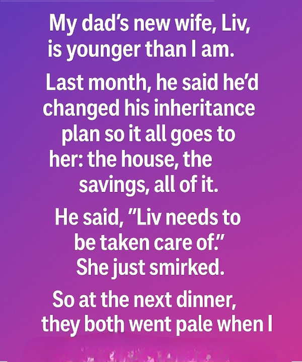 Then, last month, Dad invited me over and gently told me he had revised his will. Every asset, every savings account, the house—everything would go to Liv. He explained softly, “She needs to be taken care of.” I nodded, pretending to understand, but the slight, almost satisfied smile she gave made my stomach twist.