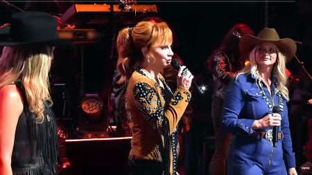 When the three powerhouses met at center stage for the chorus, the performance shifted from exciting to unforgettable. Reba’s strong, grounded tone formed the backbone of the harmony, Miranda’s smoky edge carved out the emotional center, and Lainey’s modern twang brought a fresh spark that linked past, present, and future. Their voices blended with such precision and passion that the entire arena seemed to vibrate with the sound.