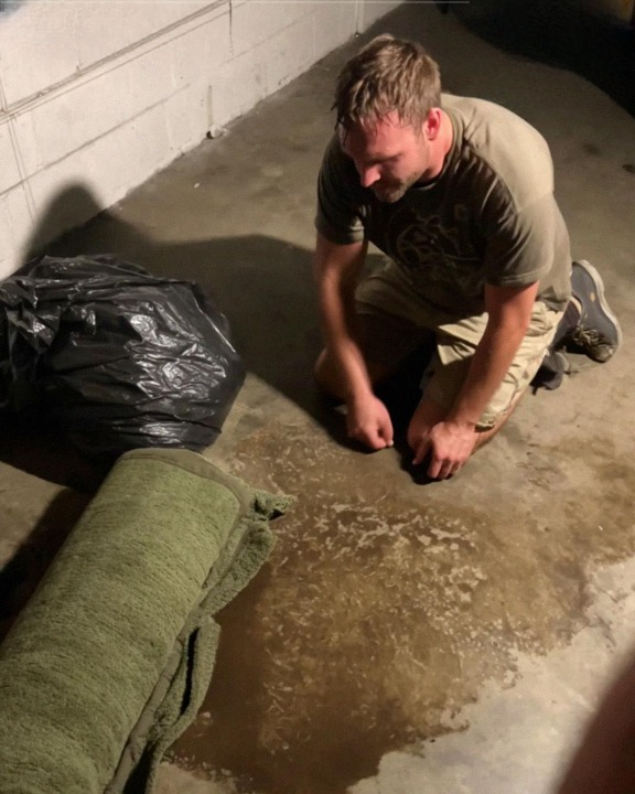 Tom was kneeling in the center of the concrete floor, gripping a scrub brush, beads of sweat forming on his forehead.