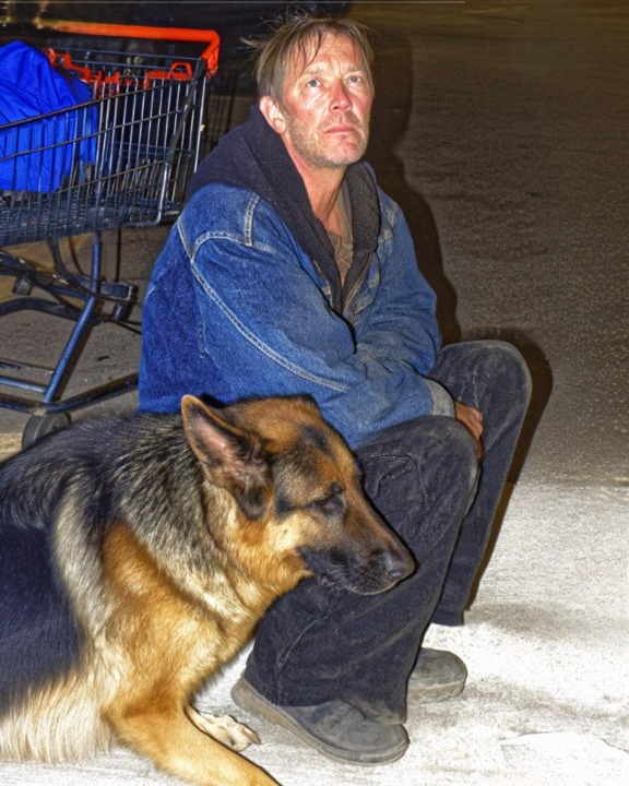 Sitting on the curb near the shopping cart corral, bundled in a thin, worn coat unsuited for the temperature. His shoulders folded inward as if he was trying to shrink away from the world. At his side was a German Shepherd, leaning against him firmly, as though guarding him from collapsing.