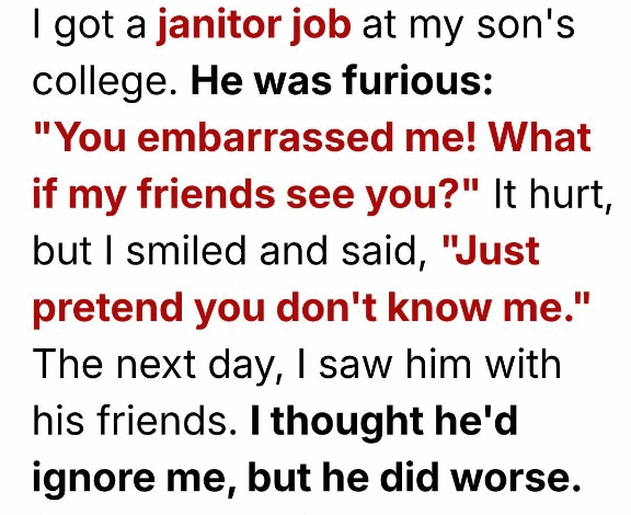 My name is Marissa. I’m forty-nine. And last month, I accepted a janitorial job at my son Logan’s university. I’m a single mother who has spent years holding together our lives by working two and sometimes even three jobs at a time. Every tuition payment, every textbook, every late-night dinner he scarfed down between study sessions… I earned all of it with exhausted hands and sleepless nights. So when a steady, reliable campus position opened up with good benefits and decent hours, it felt like the first real blessing to come my way in a long time.