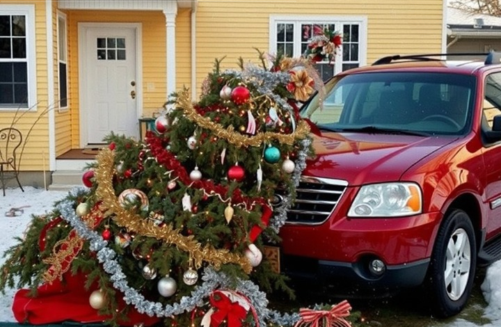 The vehicle rolled over the curb, crushed the pot, dragged the lights, and shattered every ornament. Wood splintered. Glass broke.
