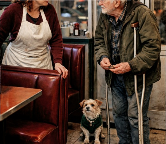 An elderly man shuffled inside, leaning hard on a crutch. His coat was too thin for the weather, his hands raw and red from the cold. Trailing behind him was the tiniest dog I’d ever seen — scruffy, bright-eyed, dressed in a little green sweater that looked handmade, lovingly repaired more than once.