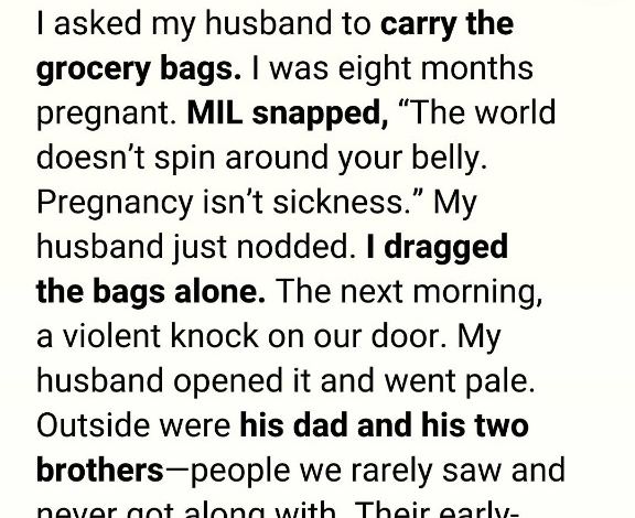 Then, the next morning, a violent knock on the door shattered the quiet. Not a polite tap, but urgent and almost angry. My husband groaned, pulled on a shirt, and went to open it. I followed slowly, hand on my belly.
