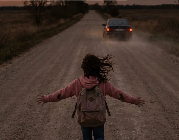 A tiny girl in a faded pink hoodie, sitting alone on the gravel shoulder of Route 16, arms wrapped around a scuffed backpack like it was the only thing holding her together.