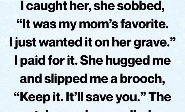 It was a small brooch—delicate, old-fashioned, shaped like a flower with a tiny blue stone at its center. I tried to refuse, but she shook her head, already backing toward the door, disappearing before I could ask her name.