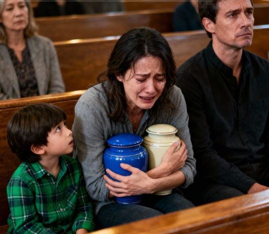 The scent of lilies mingled with the aged wood of the pews, heavy and clinging, pressing against every breath. Stained-glass windows cast muted blues and warm ambers across the room, yet nothing eased the suffocating pressure on my chest. I sat at the front, my back rigid, hands trembling as I held two urns—two delicate vessels carrying what no parent should ever have to bear.