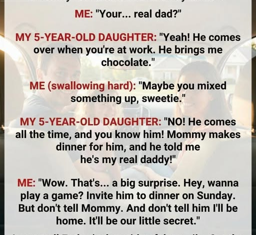 Sleep never came that night. I lay staring into the darkness, replaying her words until they dulled—then sharpened again. I wanted desperately to believe it was a misunderstanding, but the clarity of her details crushed that hope. By morning, I knew I couldn’t live with unanswered doubt. I knelt beside her with a careful smile and whispered, “What if we invite your real dad to Father’s Day dinner as a surprise? But we don’t tell Mommy. It’ll be our secret.”