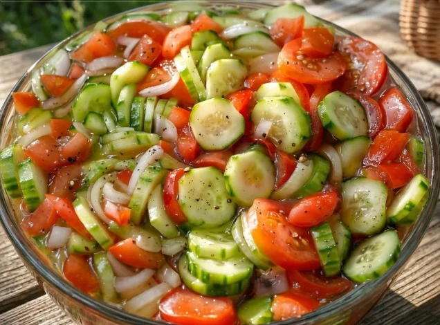 A large glass bowl filled with crisp cucumbers, juicy tomatoes, and just enough onion to give everything a little bite. Then there’s the dressing—bright, tangy, slightly sweet—and somehow it ties everything together in a way that makes every bite better than the last.