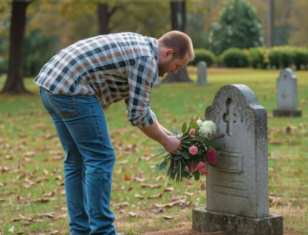 Matthew stood beside the headstone, one hand resting on it, the other holding a single rose. When he turned and saw me, his eyes filled just like mine.
