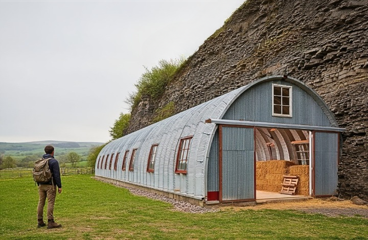 At a scrapyard, Luke met Carl, a rough-voiced seller who offered him the steel frame of an old Quonset hut for sixty dollars. The Quonset design, originally developed during World War II, was simple, durable, and built to handle harsh environments. But Luke’s real innovation came from how he worked with the landscape rather than against it. Instead of building in open space, he anchored the curved steel frame directly against the basalt wall.