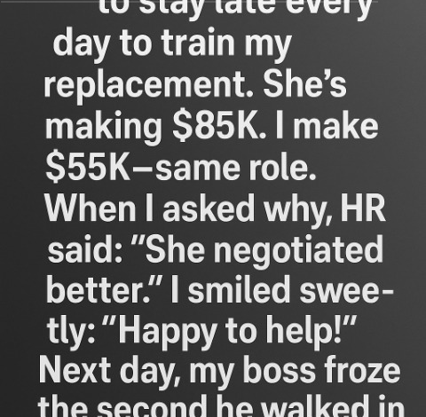 I found out I was being replaced on an ordinary Tuesday morning—the kind of morning where you sip your coffee, settle into your routine, and assume the day will be uneventful. Instead, mine cracked open like a fault line. My boss called me into his office with a face full of rehearsed sympathy, the kind he probably practiced in the mirror. He said the company was “moving in a different direction,” and before the words could even land, he added that I’d be training the person who would be taking over my role. No warning. No discussion. No gratitude. Just…