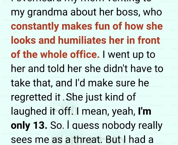 I didn’t mean to eavesdrop. I was supposed to be in my room doing homework, but my mom’s voice drifted down the hallway—tight, tired, and trying to stay quiet. She was on the phone with my grandma. “I just don’t know what to do anymore,” she said. “Every meeting, it’s something new. The way I dress. My hair. The way I talk. He laughs, and everyone else laughs with him.” I froze. My mom doesn’t complain. Ever. She works long hours, comes home exhausted, and still asks me how my day was as if it’s the most important thing in…