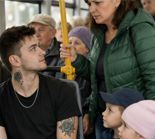 On a crowded bus, a commotion erupted when a woman carrying two children demanded that a young man relinquish his seat—but what he did next caused every passenger to stop in their tracks. The bus was full, mostly with elderly passengers. Some clutched string bags, others chatted quietly about prices or the weather. Among them, an eighteen-year-old young man sat in an aisle seat. Tattoos marked his arms and neck, a light stubble framed his face, and his dark T-shirt hung loosely on his tired frame. He didn’t engage with anyone, staring straight ahead in quiet solitude. At the next…