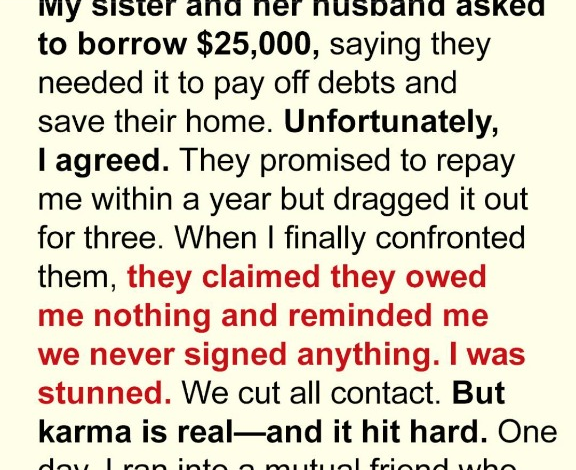 My sister and her husband asked to borrow $25,000, claiming they needed it to pay off debts and save their home. I hesitated—mixing money and family is always risky—but they sounded desperate. My sister even cried, saying they’d be homeless without help. Against my better judgment, I agreed. They promised—swore—they’d repay me within a year. For illustrative purposes only That year turned into two… then three. Every gentle inquiry about repayment was met with excuses: car repairs, medical bills, “bad timing.” I stayed patient, reminding myself they were family. Finally, after another ignored message, I confronted them directly. My sister’s…