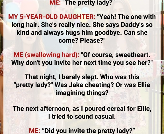 Earlier this year, my husband Jake lost his job. While he searched for new work, I took on full-time hours to keep our family afloat. Jake stayed home with our five-year-old daughter, Ellie — handling school pickups, playtime, and bedtime routines. Everything felt normal. Stable. Until last week. We were sitting at the kitchen table planning Ellie’s birthday party. She was happily listing classmates from preschool when she suddenly looked up at me, eyes sparkling, and said: “I want to invite the pretty lady who visits Daddy while you’re at work!” It felt like time stopped. I kept my voice…