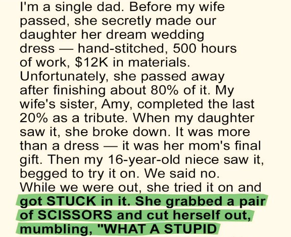 My late wife spent nearly 500 hours hand-stitching the perfect wedding dress for our daughter. It cost over $12,000 and became her final labor of love before she passed away. Last week, my 16-year-old niece destroyed it in minutes. What followed still sends chills through me. Becoming a single father at 42 was never part of the plan. Two years ago, I lost my wife, Linda, to cancer, and overnight I found myself raising our 22-year-old daughter, Sammy, on my own. Sammy is strong and independent, but losing her mother left a wound in both of us that never truly…
