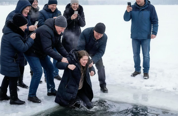 I always knew Emily had married into a family with a twisted sense of humor—but nothing could have prepared me for the shocking cruelty I witnessed one bitter winter afternoon. They called it their “annual ice tradition.” I called it what it truly was: a dangerous, reckless stunt disguised as fun. The frozen lake stretched endlessly, a stark sheet of white cracked only by a dark rectangle where someone had cut the ice. Emily stepped forward hesitantly, breath shaking in the cold, unaware that what awaited her was far from playful. In an instant, two of her husband’s uncles lunged…