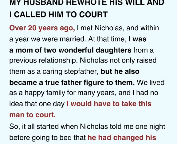 Alice shared a painful story about her marriage and how her husband, Nicholas, made a shocking decision that left her feeling betrayed after 20 years of devotion. A Stepfather Who Became “Dad” Alice met Nicholas during a very difficult period in her life. As a single mother of two daughters, she struggled to make ends meet. Nicholas and Alice fell in love quickly, and within a year, they married and moved into a home they dreamed of together. Although Nicholas had a son, Nick Jr., from a previous marriage—whom he rarely saw due to his ex-wife’s interference—he fully embraced Alice’s…