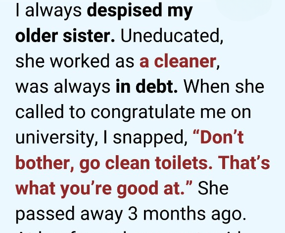 I always resented my older sister. Admitting that truth feels like carrying a weight in my chest—heavy, immovable. To me, she represented everything I feared becoming. She worked as a cleaner, spending her days scrubbing away other people’s messes. She always seemed exhausted, always smelled faintly of bleach and cheap soap, always counting coins and worrying about bills. When friends asked about her, I dodged the conversation. When classmates spoke proudly about accomplished siblings and ambitious families, I stayed silent. She was five years older than me, yet in my mind, she felt decades behind. At least, that’s how I…