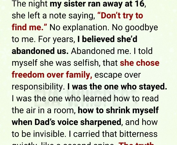 The night my sister left, I was ten years old, lying still and pretending to be asleep. What I remember most is the sound. The quiet groan of the hallway floor beneath her feet. The faint rustle of clothes. The careful pull of a backpack zipper, slow and deliberate, like she was afraid the noise might wake the whole house. I kept my eyes shut, my heart racing, certain that if I opened them, something awful would become real. She stopped in the doorway for a moment. I thought she might turn back, sit beside me, smooth my hair the…
