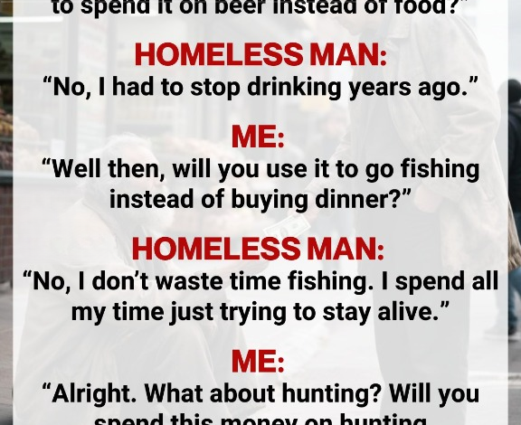 One gray, tired afternoon, I spotted a homeless man sitting on the curb. His coat was thin, shoes worn, and his beard more gray than brown. I pulled out a ten-dollar bill, hesitated, and decided to ask a few questions first. “If I give you this money, are you going to spend it on beer instead of food?” I asked. “No,” he said calmly. “I had to stop drinking years ago.” “Will you use it to go fishing instead of buying dinner?” “No,” he replied, shaking his head. “I don’t waste time fishing. I spend all my time just trying…