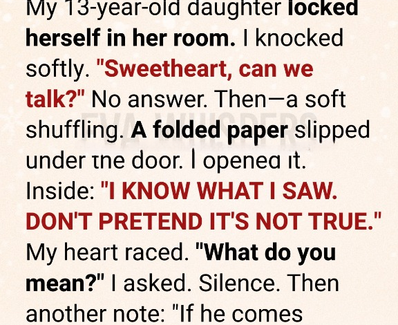 Penelope, my sixteen-year-old, had never looked at me like this before—disappointed, distant, cold. Something had changed, and I needed to fix it before it tore us apart. That night, I brought her hot chocolate and knocked on her door. “No,” she said. “Honey, what’s wrong?” I asked softly. “How could you, Mom!” she shouted, slamming the door. She wouldn’t explain anything. I stayed outside her room for hours, pleading quietly, trying to get through. Eventually, a note slid under the door: I know what I saw. Don’t pretend it’s not true. Another note followed: If he comes back tonight, I’ll…