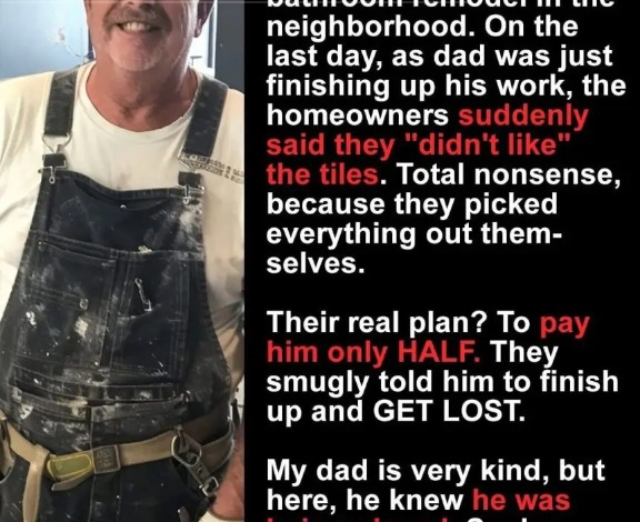 My dad works as a plumber. Recently, he took on a complete bathroom renovation for a family in our neighborhood. Everything went smoothly until the final day. Just as he wrapped up the job, the homeowners suddenly claimed they didn’t like the tile work. Which was ridiculous, because they had personally chosen every detail themselves. Their real goal quickly became obvious. They announced they would only pay half of what they owed and smugly told him to wrap things up and leave. My dad is usually patient and easygoing, but this time he knew he was being taken advantage of.…
