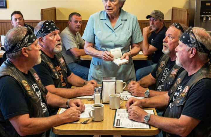 I forced the bikers to pay before they were even served because I didn’t trust them. Fifteen men walked into my diner at nine o’clock on a quiet Tuesday night, leather vests heavy with patches, long beards brushing their chests, tattoos creeping up their necks. I’ve owned Maggie’s Diner for thirty-two years. Experience teaches you patterns, and I thought I knew one when I saw it. “Money first,” I said firmly. “Everyone. Before you sit…