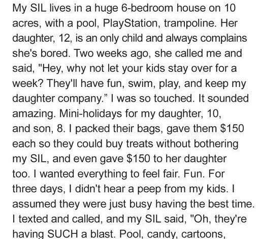 The invitation arrived at exactly the right moment, like a cool breeze during an oppressive summer. My sister-in-law, Sarah, lived in the sort of home you’d expect to see in glossy design magazines — a sprawling, ultra-modern property with an infinity pool, an enormous trampoline, and even a private gaming room. She reached out with an offer that sounded generous and harmless: she wanted my two kids to spend a week with her. She explained…