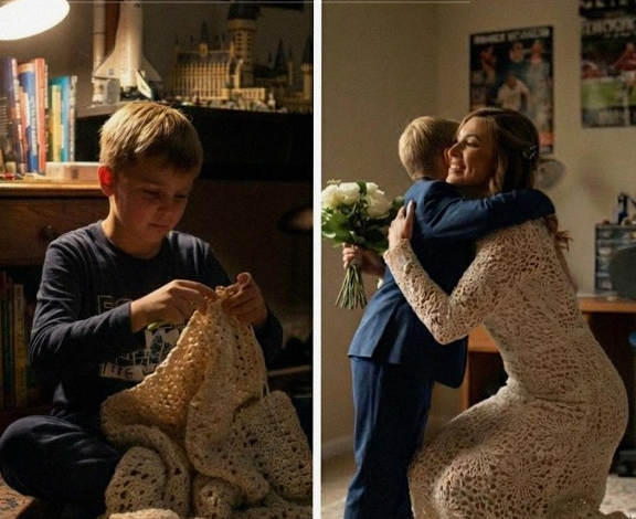 When my twelve-year-old son crocheted my wedding dress, I believed it was the most beautiful gift anyone could ever give. But when my mother-in-law mocked him in front of everyone, calling it a “tablecloth” and reducing my child to tears, my husband responded in a way that made me fall in love with him all over again. I never imagined my wedding day would become the moment that reshaped our family forever. Not because of…