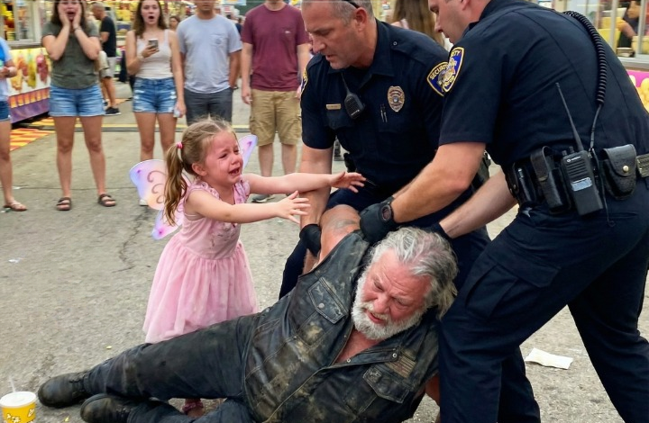 The scream that rang across the fairgrounds came from a little girl in a pink fairy dress, echoing over a scene no family should ever witness. Five-year-old Lily watched in terror as two police officers threw her grandfather to the ground, all because someone decided a man in a leather vest couldn’t possibly be the loved grandfather of a little girl. My name is Rebecca, and the man pinned to the asphalt was my father.…