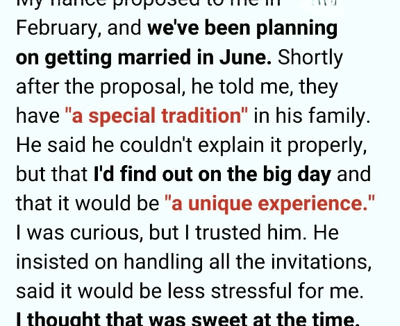 My fiancé proposed in February beneath hundreds of fairy-lights he’d strung up just for me. I genuinely believed I was the luckiest woman alive. By March, we had already picked a June date, sampled cake flavors, and bickered over roses versus peonies—just two people excitedly planning a future together. Then he brought up something unusual. His voice dropped lower than usual, almost like he’d practiced it. “There’s… a tradition my family follows at weddings,” he…