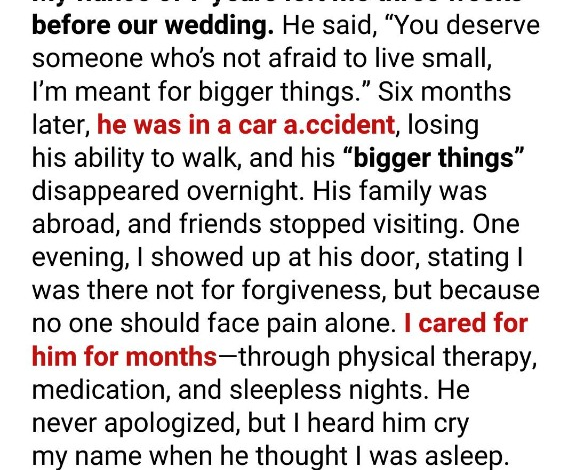 My fiancé of seven years left me three weeks before our wedding. No fight. No warning. Just a sentence that carved itself into my memory like a scar: “You deserve someone who’s not afraid to live small. I’m meant for bigger things.” For illustrative purposes only He said it with a confidence that made me feel tiny, as if our life together had been a stepping stone he’d outgrown. I remember standing there, my wedding…