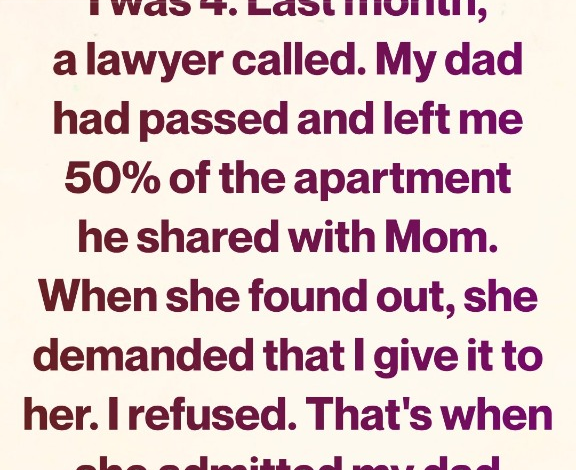 My dad disappeared when I was four. No explanations. No pictures taken down from the walls—just a sudden, suffocating absence. For years, I imagined him drifting through some other life in another city, starting fresh with a new family he loved more than us. Last month, a lawyer called: my father had passed away and left me 50% of the apartment he once shared with my mother. When she found out, she demanded I hand…
